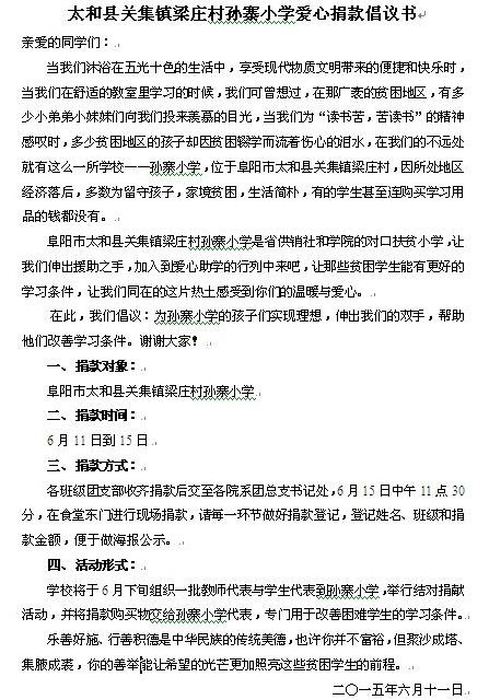 献绵薄之力,涌温暖之泉。6月15日,学院为省供销社结对帮扶的太和县孙寨小学发起爱心募捐的倡议,活动共募集了爱心捐款一万九千余元。