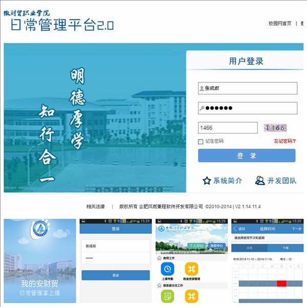 学院日常管理平台2.0由电子信息系互联软件开发中心的专业老师带领软件技术专业2012级的学生共同开发的,目前,该平台可以实现教室资源使用情况的查询,此外,“学生请假和考勤管理”模块、“教师调课管理”模块也将于近日上线运行。