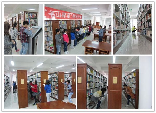 “书山寻宝”活动的起点在电子阅览室,同学们通过登录图书馆馆藏检索系统查询自己抽中的5本图书的索书号后,根据经验辨别图书位于的书库,并前往所在书库将全部图书借出,送回到电子阅览室,由那里的裁判老师裁定所借图书的正确与否和用时长短,在寻书无误的基础上,用时少的同学胜出。