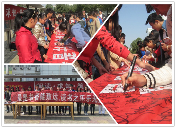 活动现场围满了同学,纷纷在条幅上签下自己的名字,并表示付诸行动,每天坚持读书、读好书。学院领导与老师也参与进来,郑重签名,长长的横幅就被签满了名字,表达了广大师生对读书的热情与支持。