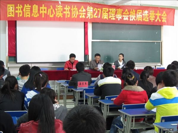 4月13日中午,学院图书信息中心读书协会第27届理事会换届选举大会在7201教室举行。学生处副处长张伟、团委副书记朱玫林、图书信息中心主任张克及社团联合会主席、各兄弟社团负责人应邀出席本次大会。