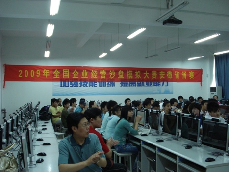 6月13日,“2009年全国大学生企业经营管理沙盘模拟大赛”安徽省省赛在我院实训楼举行。六安职业技术学院、安徽交通职业技术学院、安徽电气工程职业技术学院、淮北职业技术学院、芜湖职业技术学院、宿州职业技术学院、安徽工业大学职业技术学院、安徽国防科技职业学院、安徽工业经济职业技术学院、安徽机电职业技术学院及我院来自全省各地共11所高职院校16支队伍参加了比赛。