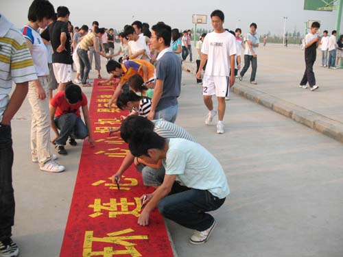 在活动现场,两条写着“神州大地点燃激请圣火 华夏儿女唱响奥运精神”和“五环连心 心心相印 奥运精神 人人共勉”的横幅像两条腾飞的火龙一般散发着热情,数千名同学来到操场积极参与签名,十几分钟后,横幅上布满了同学们的签名和支持奥运、支持汶川人民的话语。