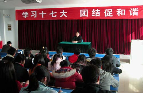 [dvnews_page]12月19日下午,5102教室座无虚席,学院党委副书记毛礼明在这里为全院200余名学生干部作了一场题为《认真学习领会十七大精神 坚定不移走中国特色社会主义道路》的形势政策报告,五个系的党总支书记、团总支书记参加了报告会,此次报告会由院党委宣传部和院团委共同举办。
