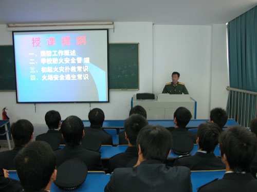 [dvnews_page] 11月22日,院保卫处特邀安徽省消防总队教导大队参谋李燃上尉来学院进行消防安全知识培训。李燃上尉向院保卫人员、教职工义务消防队员和院学生会治保部同学,详细介绍了火灾的基本概念、火灾的预防、初期火灾的扑灭、火场逃生、灭火器材的使用等消防安全知识。