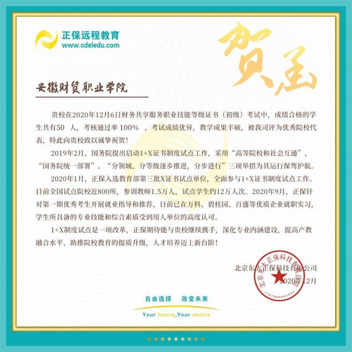 作为教育部1+X财务共享服务、业财一体信息化、财务数字化应用三门职业技能等级证书试点院校,财会金融学院多位教师积极参与前期集中培训,保质保量完成教学任务,为学生顺利通过考试打下了坚实的基础。职业技能等级认证进一步提升了学生职业技能水平,为社会培养了更多适合企业需求的高素质、复合型技能人才。