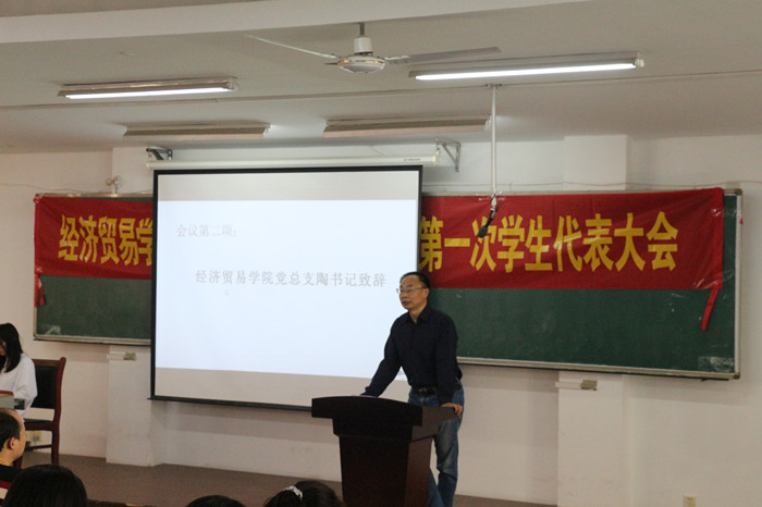 大会在雄壮的国歌中开幕,陶云龙在大会上致辞,他勉励即将当选的下一届团学青年顺势而为、奋发向上,坚定信念,锤炼本领,提升工作格局和意识,以服务全体同学成才成长为己任,希望他们要始终坚持思想引领、学风引领,要明确职责、严格要求、注重学习,不断提升工作能力和水平,努力做到才学能力双丰收,开创经济贸易学院团学工作新局面。