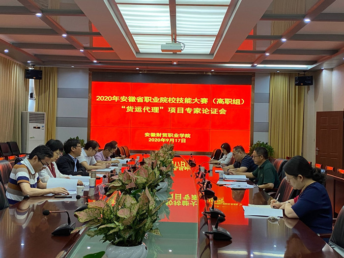 9月17日下午,由安徽省教育厅主办,我校承办的2020年安徽省职业院校技能大赛(高职组)“货运代理”大赛专家论证会在我校召开,来自行业企业和部分高校的5位专家受邀出席。会议由行知管理学院院长黄诗义主持,出席会议的专家有:中外运物流华中有限公司董事长、高级经济师周保昌,合肥工业大学教授刘晴,安徽大学教授梁雯,合肥学院教授杨学春,学院科研处处长王海龙。行知管理学院副院长刘大俊及组织本次大赛的相关负责老师参加会议。