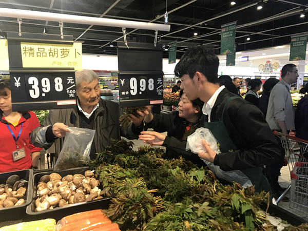 4月14日至15日,五位同学分别在合家福超市(马鞍山路店、沿河路店、高新区店)和联家超市(西藏路店)和永辉超市(天鹅湖店)进行志愿服务,同学们准时上岗、规范着装、积极宣传产品。杨熔生同学一边吆喝一边包装,他的销售业绩很好,一早上两箱香椿头就销售一空,急等着补货;而在联家超市的陶飞龙同学就遇到了较大阻力,自己售卖的价格比超市同期售卖的香椿头贵1元/斤,他和销售阿姨一起想办法,靠着精细的包装和卖力的促销最后也获得了不错的销售成绩;程伟伟同学刚开始促销的时候比较害羞,慢热的他经过老师的指导和鼓励,逐渐放开自己,积极和顾客交流,推销自己的香椿头产品。