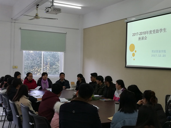 12月20日中午,雪岩贸易学院召开2017-2018学年度受助学生座谈会,2016级、2017级共31名受资助学生代表参加座谈会,雪岩贸易学院党总支书记高尔定,专职辅导员、学生秘书和团干参加了会议。