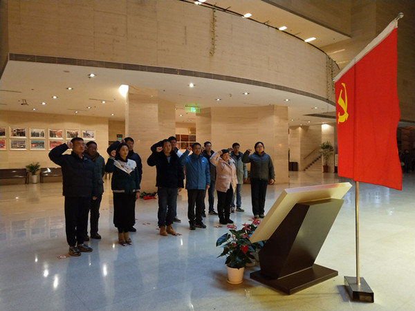 在渡江战役纪念馆一楼展厅,面对鲜艳的中国共产党党旗,在支部书记张克领誓下,行政第三支部全体党员重温入党誓词。当铿锵有力的宣誓声响起时,在场的每一名党员都深受感染,为之振奋。