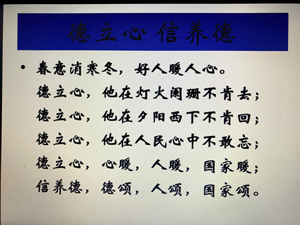 在谢征宇老师的课堂中,工商1701班吴飞结合自己的参观心得以“德立心、信养德”为题赋诗一首:春意消寒冬,好人暖人心;德立心,他在灯火阑珊处不肯去;德立心,他在夕阳西下不肯回;德立心,他在人民心中不敢忘;德立心,心暖,人暖,国家暖;信养德,德颂,人颂,国家颂。吴飞同学表示,好人好比一盏灯,在温暖我们心灵的同时,也照亮了社会公德的方向,他们彰显了中华民族的优秀品质,弘扬了社会主义国家的风尚。