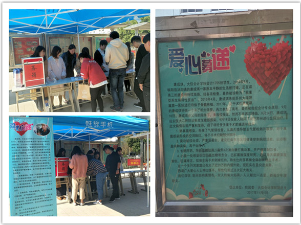 在得知唐成琪同学的病情后,大位会计学院师生召集所有老师和班级发起捐款倡议书,组织学生募捐。一场声势浩大的爱心捐款行动在校园内迅速开展起来,广大师生纷纷解囊,捐款相助,在校园里传递着爱的温暖与无私的奉献。经过短短几天时间,校园累计捐款金额达两万多元。学校领导以及老师也通过电话、慰问短信等方式纷纷表达对他的关心和祝福,并把善款交到了他妈妈的手中。