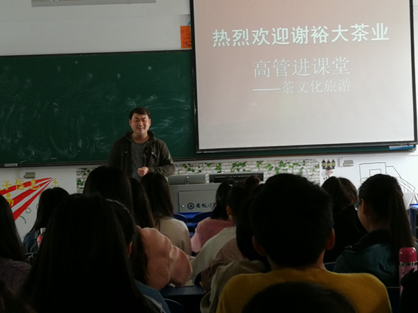 11月3日上午,雪岩贸易学院经茶教研室邀请了安徽谢裕大茶业有限公司的两位高管走进课堂,谢裕大合肥分公司副总高鹏勇和人事经理华冠杰为旅游专业的同学作了“茶文化旅游”的专题讲座。