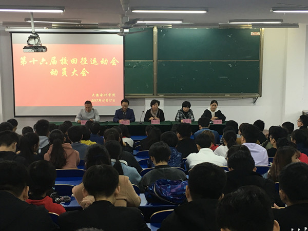 10月17日中午,大位会计学院在6103教室召开第十六届田径运动会动员大会。参加会议的有大会计学院副院长姚云霞、党总支副书记张少兵、副院长李红梅,教练桑磊、团总支书记沈丽萍、全体专职辅导员以及学生会各部部长、体育部全体干事和全体运动员。