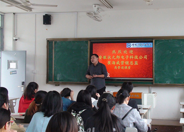 10月19日下午,雪岩贸易学院邀请安徽状元郎电子科技有限公司营销总监崔海威为营销1603班同学们做了一场“教育装备产品区域市场销售业务管理”的课题教学。