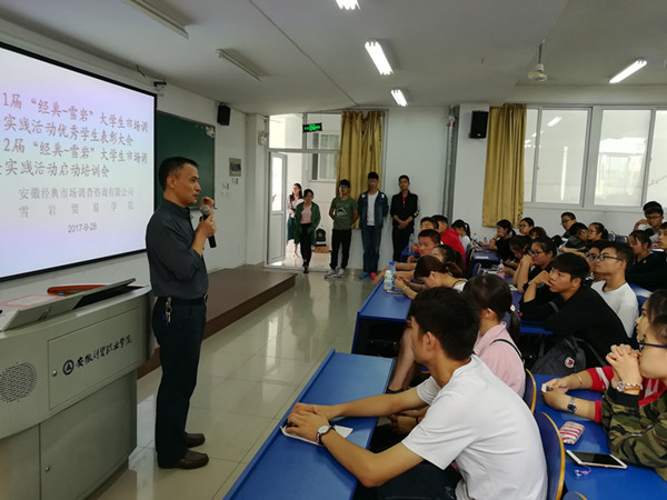 9月28日中午,由安徽经典市场调查咨询有限公司、雪岩贸易学院联合举办的第一届“经典-雪岩”大学生市场调查实践活动优秀学生表彰大会暨第二届“经典-雪岩”大学生市场调查实践活动启动培训会在6301教室举行,安徽经典市场调查咨询有限公司研究主管夏坤、雪岩贸易党总支书记高尔定,以及学院营销策划协会、汽车营销协会150多名同学参加了会议。会议由市场营销教研室主任江友农主持。