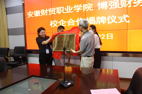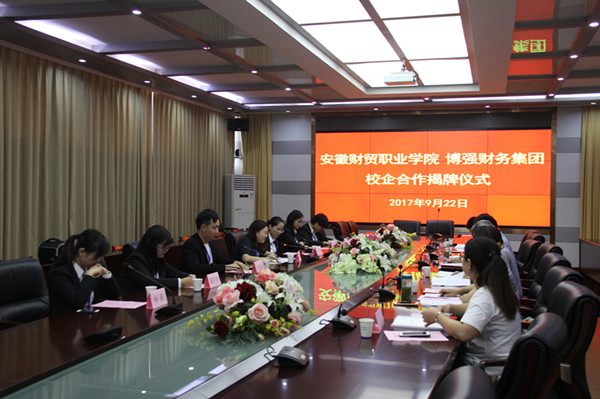 9月22日上午,合肥博强财务公司董事长余雪一行与茂荫财金学院在行政楼第四会议室举行校企合作揭牌仪式,校长助理吴晓光、邓庆安,茂荫财金学院副院长方春龙及财务管理教研室参加了此次揭牌。