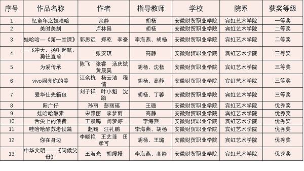 学期末,宾虹艺术学院组织师生积极准备第九届全国大广赛,共向安徽省的大赛组委会递交13项参赛作品。近日,安徽省比赛结果揭晓,宾虹艺术学院喜获1个一等奖、2个二等奖、4个三等奖、6个优秀奖。其中,一等奖《忆童年之哇哈哈》作品及创作者动画1501班级余静同学入围国赛。