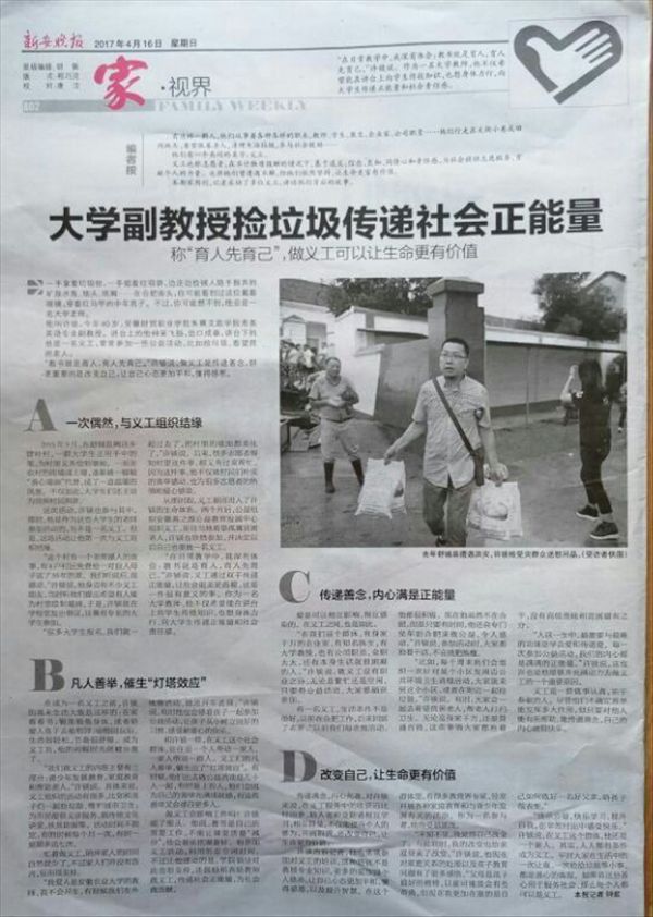 “一手拿着垃圾钳,一手提着垃圾袋,边走边捡被人随手抛弃的矿泉水瓶、烟头、纸屑……在合肥街头,你可能看到过这位戴着眼镜,穿着红马甲的中年男子。他叫许锬,今年40岁,安徽财贸职业学院朱熹文旅学院商务英语专业副教授。讲台上的他风采飞扬,出口成章,讲台下的他还是一名义工,常常参加一些公益活动,比如捡垃圾、看望贫困老人。”这是4月16日刊登在新安晚报上关于朱熹文旅学院一名党员教师的生活侧写,朱熹文旅学院党总支副书记宋凌云表示,像许锬老师这样的优秀共产党员,朱熹文旅学院还有很多。