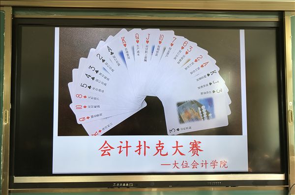 大位会计学院在今年上半年考察全国部分兄弟院校时发现,有的院校寓教于乐,将扑克牌这一学生日常的休闲娱乐方式通过改造,形成了一套有趣的会计扑克牌游戏,既玩又学,效果反映很好,学生喜欢。于是在今年的会计文化节中,大位会计学院大胆尝试,进行了教师组比赛和学生组比赛。