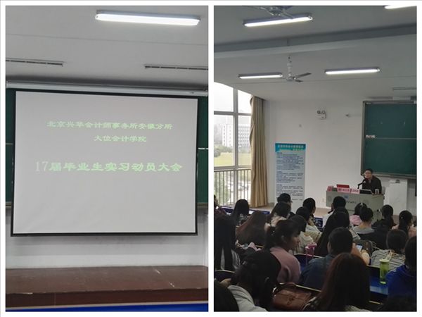 10月21日上午,大位会计学院2017届毕业生顶岗实习动员大会在6302教室举行。大位会计学院副院长姚云霞,大位会计学院兼职院长、兴华会计师事务所安徽分所所长汪和俊,兴华会计师事务所安徽分所市场部经理曹伟,大位会计学院部分专业老师参加了动员会。