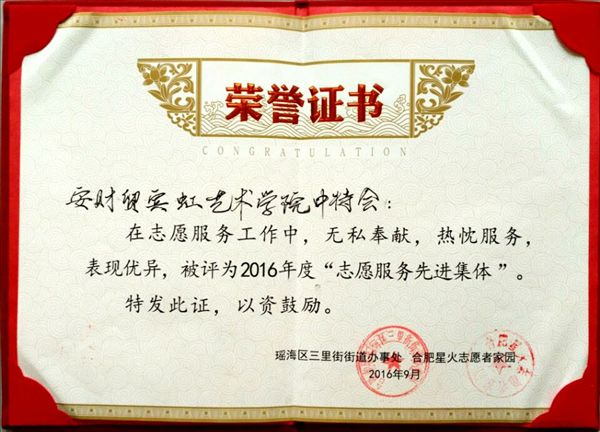 10月9日是九九重阳节,宾虹艺术学院参加合肥市“九九重阳圆梦大蜀山”大型敬老助残倡导活动,被评为2016年“志愿服务先进集体” 荣誉称号。