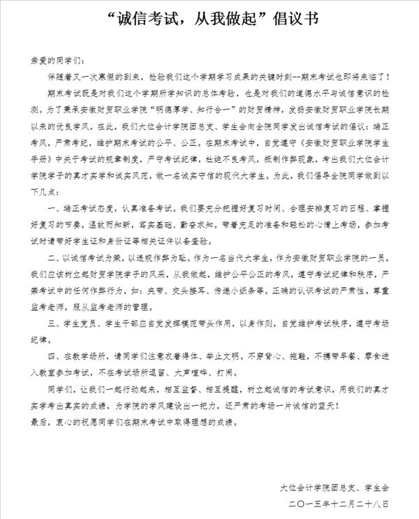 12月29日,大位会计学院官方微博发布了《诚信考试,从我做起》的倡议书,学生秘书武军老师也在自己的腾讯空间、微信上发表了对诚信考试的观点,不少同学网上点赞表示同意。
