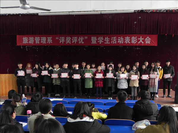12月30号中午,旅游管理系2015年评奖评优暨学生活动表彰大会在5103教室举行。系刘葆主任、党总支副书记宋凌云、商务英语教研室谢峰主任、公共英语教研主任田南竹、旅游管理教研室主任钱晓慧、2015级新生辅导员出席了表彰大会,学生秘书汪双主持会议。