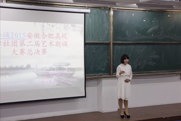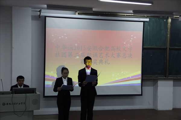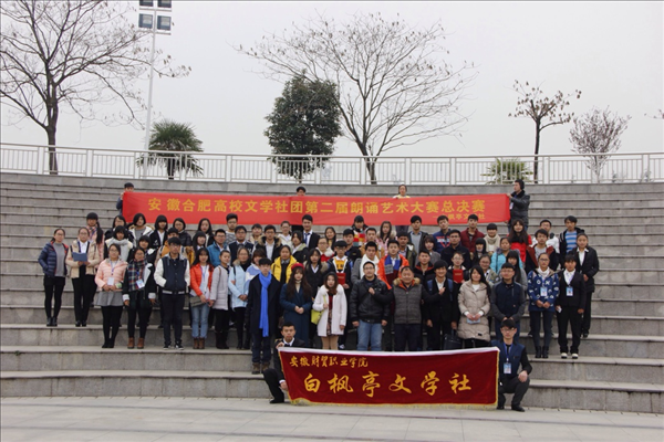 12月5日,基础部白枫亭文学社承办中华诵2015安徽合肥高校文学社团第二届朗诵艺术大赛总决赛。来自安徽警官职业学院、安徽三联学院、安徽新华学院、安徽工商职业学院及我院的选手参加了决赛。安徽省青年作家联合会秘书长征元子、委员冯圣来、瞿蕾、吴沁倩、钟凯应邀担任了评委,安徽警官职业学院等合肥十五家高校的文学社团负责人到场观看了比赛。