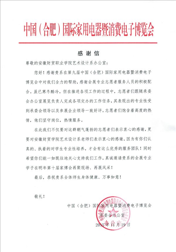 11月13日至15日,第九届中国(合肥)国际家用电器暨消费电子博览会在合肥滨湖国际会展中心举行,受承办方安徽佰鑫会展有限公司的邀请,艺术设计系选派20名广告与会展专业的学生参加会场的协调和服务工作,该系领导全程带队。