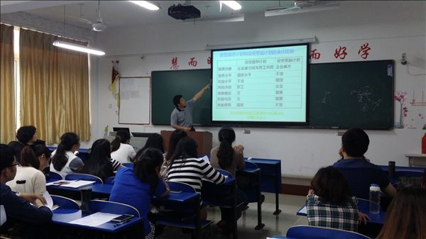讲座中,陈教授从薪酬准则出台的背景及修订内容入手,层层深入,将新旧准则进行了对比,详细介绍了带薪缺勤、利润分享计划、长期职工福利等内容,并将自身丰富的会计实务经验及卓著的理论研究成果相结合,针对设定提存计划等的会计处理方法为教师们进行了深度解析,让在场教师受益匪浅。