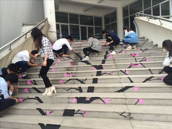 在征询相关部门的意见后,经请示学院同意,艺术设计系的同学们学习之余利用课余时间集体创作了这幅100多平米的艺术涂鸦。为了让作品直观感受效果最佳,创作前,同学们还仔仔细细地打扫清洗了露天楼梯,将全部的苔癣和污渍去处干净,然后用准备好的不脱色涂料、笔刷、喷漆和油漆等材料,在生硬的水泥楼梯上创作出一幅硕大的樱花树。