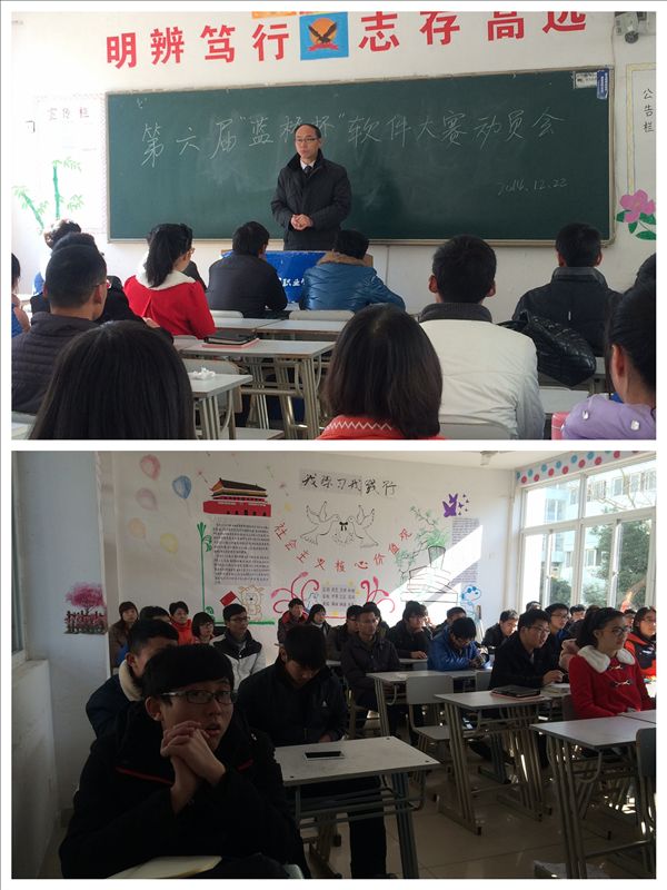 12月22日,电子信息系在3014教室召开2015年第六届“蓝桥杯”全国软件与信息技术专业设计大赛动员大会。电子信息系副主任张成叔,大赛指导老师王会颖、李宁、陆慧、霍卓群、黄洁、陈良敏和胡配祥以及全体参赛同学参加了动员会。