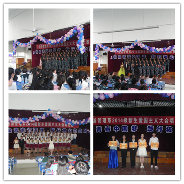 10月8日下午,5103教室座无虚席,旅游管理系“唱响青春中国梦、践行社会主义核心价值观”2014级新生爱国主义大合唱比赛在这里隆重举行。学生处处长薛卫敏,国际交流中心主任邵会如,保卫处副处长陈浩然,旅游管理系主任刘葆、党总支副书记宋凌云,学生处学生资助中心主任王学峰,图书信息中心张琼老师担任评委。