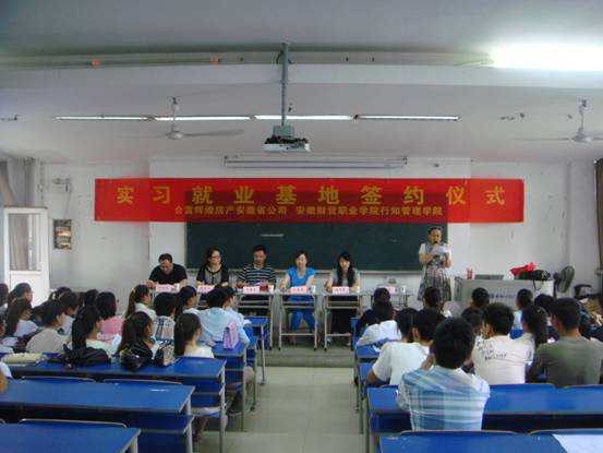 方春龙和孔晶晶在校企合作协议上交换签字,并为实习实训就业基地揭牌。合富辉煌房产公司是2004年在香港主板上市的内地首家房地产代理公司,近十年来在房地产代理公司排名中保持安徽省第一、全国前三的位次,与万科、恒大、保利等一线开发商有着长期良好的合作关系。