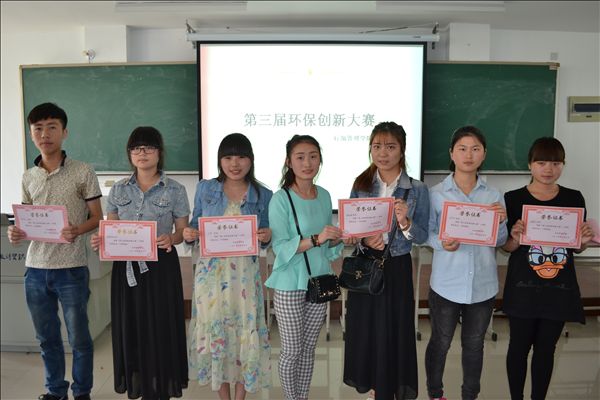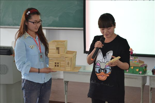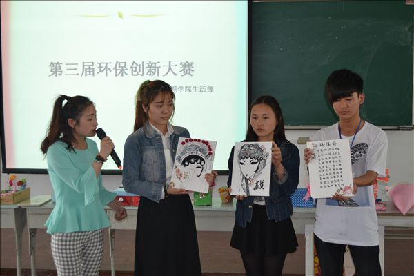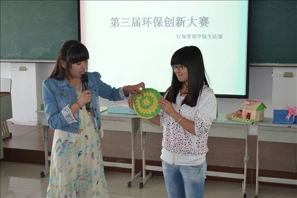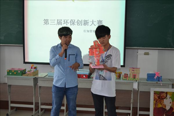 本次比赛共收到来自各院系的80多件环保创新作品,其中20件作品入围本次决赛。决赛上,各选手分别对自己的作品进行讲解。这些作品做工精致,匠心独具:如用纸杯做成的灯罩,竹筷做成的房屋模型,废弃纸盒做成的收纳盒等,原本将被废弃的东西经过同学们的巧手改造,变成了一件件精美实用的艺术品。最终,装饰1202班费珊珊的《戏说环保》获得评委的一直好评,荣获一等奖;国商1301班孙杉杉的《节水阀》和工商1302班王雪的《杯垫》获得二等奖;国商1301班林倩仪的《筷子工艺品》、商英1303班耗雅倩的《三件套》和物流1302班陈润志 的《小木屋》获得三等奖。