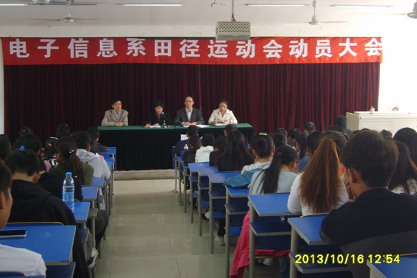 10月16日中午,电子信息系召开了学院第十二届田径运动会动员大会,系党总支书记程众、系副主任张成叔、系副主任姚成、学生秘书梅云凤、甲组领队葛文龙、乙组领队陈祥生和各班主任出席了大会。