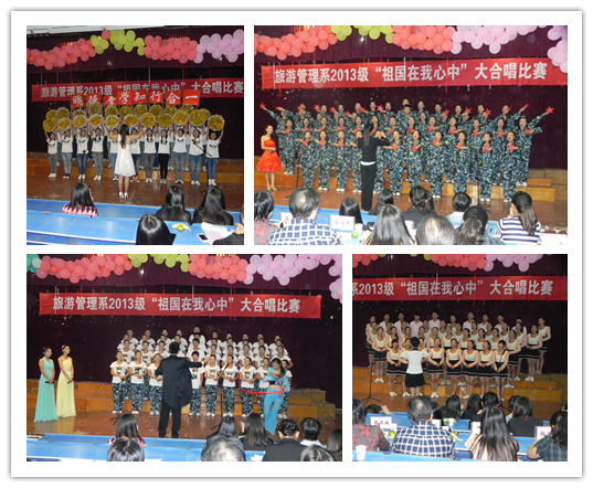 青春的旋律张扬着个性,整齐有力的合唱震撼着评委们的心灵。在中华人民共和国成立64周年即将到来之际,9月26日晚,旅游管理系2013级新生“祖国在我心中”大合唱比赛在5103教室隆重举行。学生处处长薛卫敏、保卫处副处长陈浩然、电子信息系党总支书记程众、旅游管理系党总支副书记宋凌云等出席比赛并担任评委。