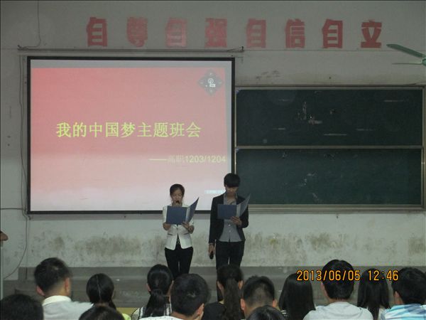 6月5日中午,高职1203、1204合班在一楼阶梯教室召开“我的中国梦”主题班会,同学们通过对梦想的唱响,激发了爱国的热情。副主任宋凌云、杨声及各班班主任、学生干部到场观摩。