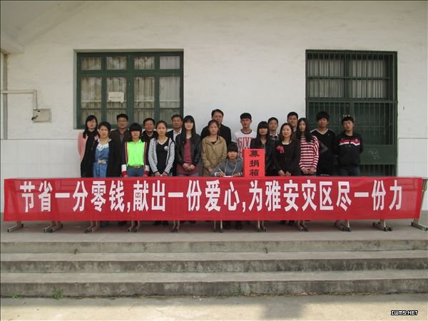 4月24日,教学楼一楼拉起了“节省一分零钱,献出一份爱心,为雅安灾区尽一份力”的募捐标语,各班班长纷纷走向募捐箱,将班上同学平时节省下来的钱投入箱内。灾害无情,人间有爱。此次共募集善款5562元,这些善款将由学院统一转交给相关赈灾部门,为雅安重建略尽绵薄之力。