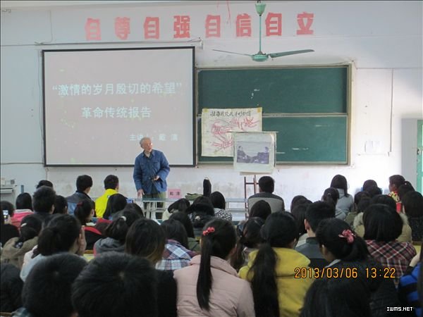 3月6日下午,82岁高龄的革命前辈戴清老人应邀在东校区为同学们作了一场题为“激情的岁月、殷切的希望”的革命传统报告会,中专部领导班子到场聆听。戴清老人16岁参加革命,历经淮海、渡江、上海等著名战役。战争年代,他冲锋陷阵、出生入死、屡立战功,解放后在人武部、教育局、科技局等单位任职。离休后,老人仍然保持着高涨的助学热情,每年从自己工资中拿出80%资助和奖励优秀贫困学生,并义务进行爱国主义宣讲,目前,已在多所中小学作了两百多场报告,以实际行动关爱青少年健康成长。