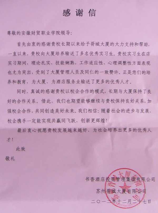 旅游管理系2010级徐燕、董昭君、王积苗同学在苏州书香胥城酒店实习期间,工作积极努力,表现优秀,受到了企业的充分肯定和高度评价,体现了学院人才培养的显著成果。现在实习期已满,3位同学已经留在酒店就业。日前,企业给我院发来锦旗和感谢信,感谢学院长期以来的支持和帮助,期待进一步加强校企合作。
