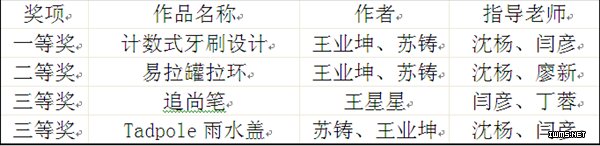 艺术设计系王业坤、苏铸共同设计的计数式牙刷、易拉罐拉环、Tadpole雨水盖分获一、二、三等奖,王星星设计的追尚笔荣获三等奖。沈杨、闫彦、廖新、丁蓉等四位老师给予了悉心指导。