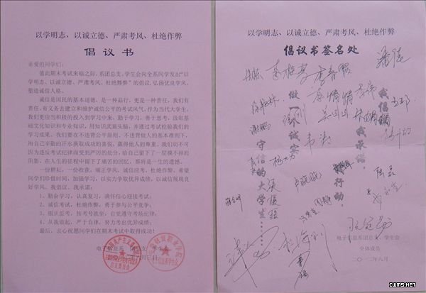 6月4日,电子信息系团总支和学生会向全系同学发出“以学明志 以诚立德 严肃考风 杜绝作弊”的倡议书,该系全体团学干部带头认真学习,充分发挥团学干部的先锋模范带头作用,郑重承诺要珍惜时间,加强学习,以身作则,严格自律,文明考试,坚决杜绝各种作弊行为,牢记“考试失败还有机会,考试作弊失去诚信”,以实力争取优异成绩,以诚信展现良好学风。全体团学干部率先在承诺书上签名,增强了学生干部诚信意识和自律意识。