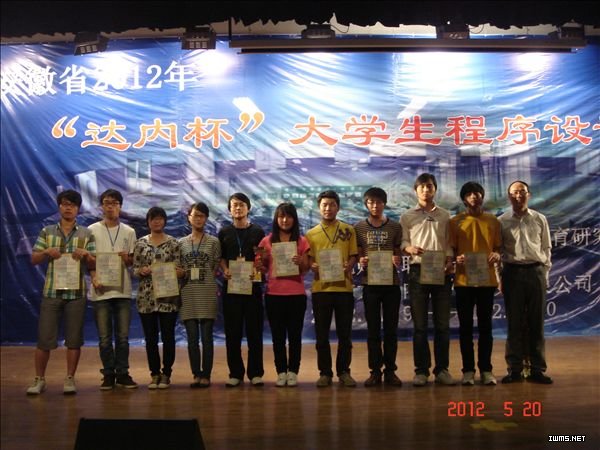本次大赛由安徽省高等学校计算机教育研究会主办,采用国际大学生程序设计竞赛(ACM/ICPC)竞赛模式,3人一队,共同解题,每题限制竞赛时间,总比赛时间为5个小时。全省23所高校共50支团队(本科39支,高职高专11支)参与角逐。我院软件1001班陈大伟、软件1101班郭前进和软件1102班李敏敏三位同学获一等奖,软件1002班周伟、王子洋和曹雪三位同学获二等奖。今年是电子信息系第二年参加该项比赛,成绩也在去年两个二等奖的基础上取得了一定突破,在该系即将出征“2012全国软件大赛北京总决赛”的时刻,起到了鼓舞斗志、增强信心的效用。