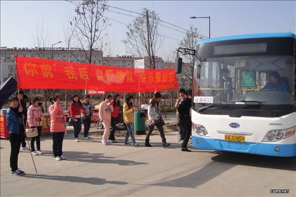 公交车是一个城市的流动窗口,公交文明直接体现着一个城市的市民素质,直观反映一个城市的文明程度。在学院门前的602、606车站,行知管理学院组织部的同学们做起了义务秩序维持员,他们每天分两个时间段(中午休息时间和下午休息时间)出现在这里,举着“你前,我后,自觉排队,快乐乘公交”宣传横幅,引导同学们和附近居民排队候车,文明乘坐公交,树立财贸新风。