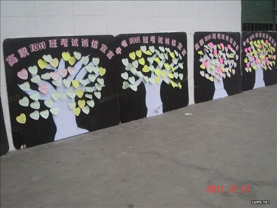 本次活动以班级为单位展开,2010及2011级各班均制作了富有班级特色的展板,同学们庄重地书写下自己的“诚信考试”宣言。空白的展板在同学们的笔下变得生动起来。一幅幅生动的图画、一张张精彩的照片、一串串潇洒飞扬的字符,显得和谐又美观,成为校园中一道亮丽的风景线。每一份诚信宣言都是同学们的庄重承诺,表达了同学们对诚信考试、诚实做人的执著追求。