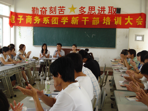 5月25日,电子商务系召开团学新干部培训会,系党总支书记邓庆安、团总支书记宋凌云出席会议,新一届系学生会主席侯志成与系团总支副书记鲍珍珍主持会议。