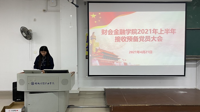 4月21日下午,财会金融学院在6103教室召开2021年上半年接收预备党员大会,学院62名师生党员及114名发展对象参会,大会由党总支副书记、学生党支部书记李健主持。